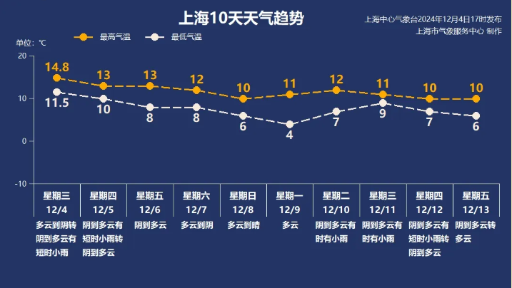 具体预报:上海今天夜里到明天阴到多云有短时小雨,明天气温10~13℃,偏北风3~4级,空气相对湿度95%~50%。