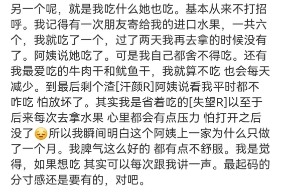 王灿在文中提到,曾有一个住家阿姨,吃她家的东西,从来不打招呼。
